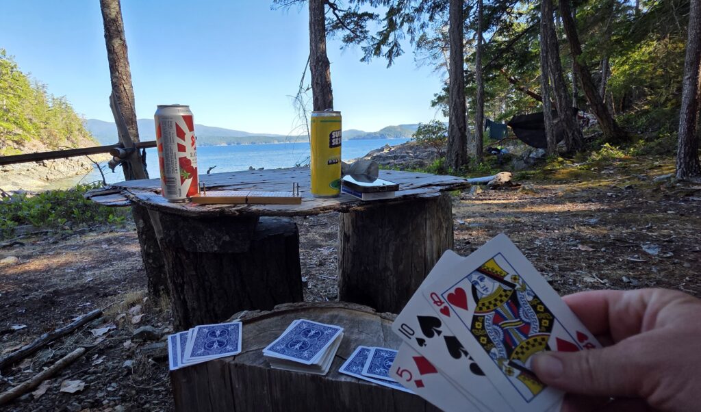 Details were thin, but we hatched a plan that would have us on the Curme Islands for week in July. It meant a day and a half of driving, an early morning departure from Okeover, and a 12 mile paddle to “home” for the next four nights, day paddles exploring the area, and a 12 mile paddle back to the van. The trip was incredible. Every day was sunny with highs in the 80s, there was no wind to speak of, and boat traffic was only in the distance. We did have the constant company of yellow jackets, but they were after our food, and paid us little attention. One day, we even ventured across Homfray channel to Refuge Cove and treated ourselves to frosty cocktails and lunch.