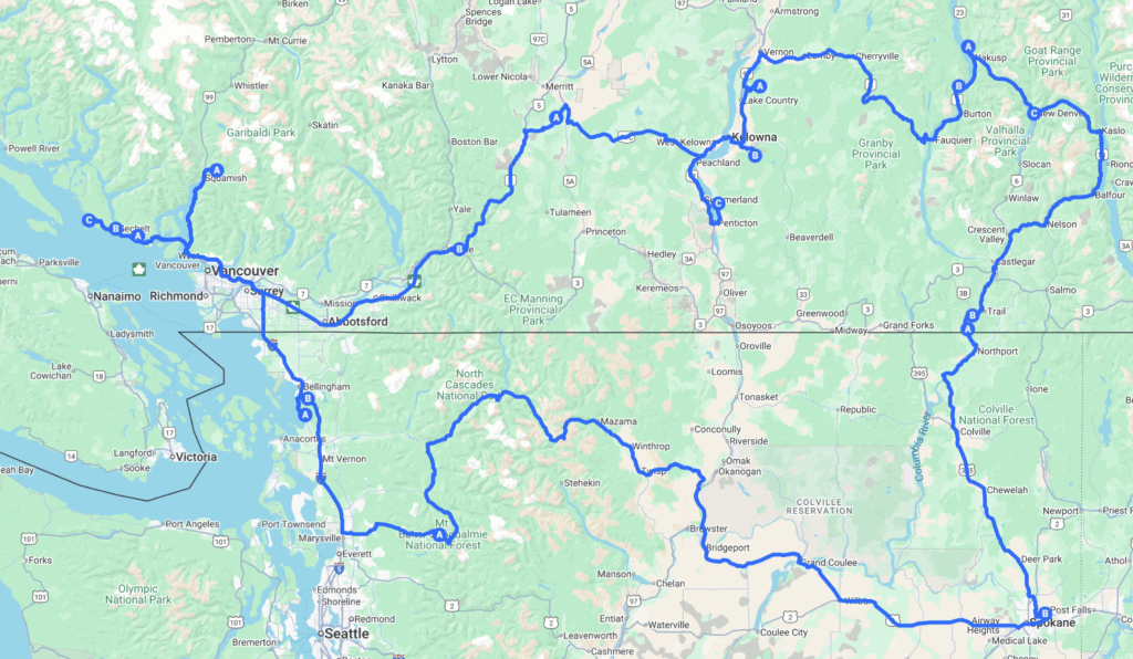 Bikes in Rossland, paddling in Arrow Lake, camping on Oyama Lake with a lake front spot and fresh caught trout for breakfast, checking out the trestles and tunnels on the Kettle Valley Rail Trail, more bikes in Penticton, the famous Half Nelson trail in Squamish, our first open ocean paddle across Welcome Passage and around South Thormanby Island, a final ride exploring the B&K trail system, and a stop off at the Big 4 Ice Cave on the way home.